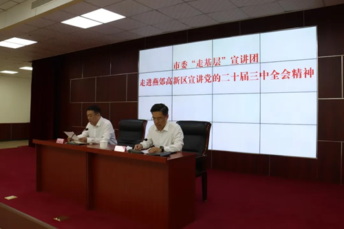 為全面準確深入闡釋黨的二十屆三中全會精神,進一步引導廣大黨員干部群眾切實把思想和行動統一到黨的二十屆三中全會精神上來。近日,市委“走基層”宣講團走進燕郊高新區開展黨的二十屆三中全會精神專題宣講。高新區黨工委領導班子成員、機關各部門正副職參加了活動。