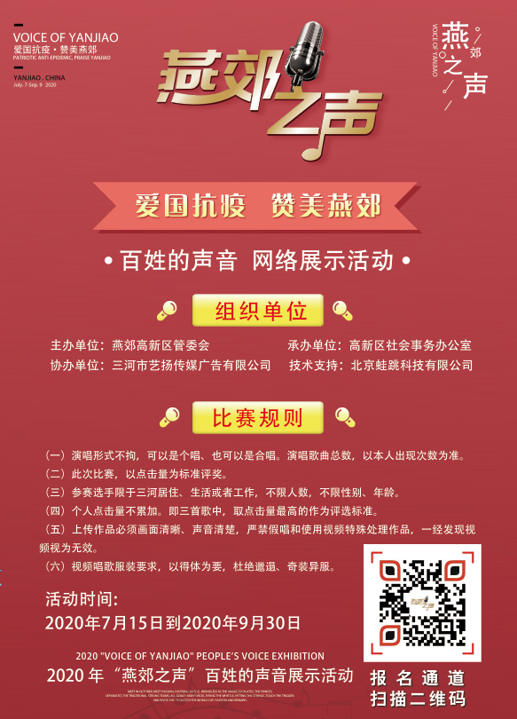 本次活動以網絡評比的方式進行。參賽選手不限性別、年齡,只要在三河居住、生活或者工作,均可報名。演唱內容突出愛國抗疫為主,贊美燕郊,歌頌傳統文化為輔,內容積極向上,提倡原創。活動設置冠軍一名、亞軍一名、季軍一名,最佳人氣獎200名。以點擊量為評判標準,想要報名的選手可通過掃描圖片二維碼參加。報名時間截止到8月10日,具體演唱要求也可通過掃描二維碼了解。