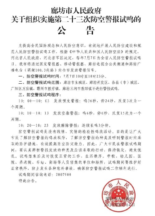 7月7日上午10時!三河市將試鳴防空警報!