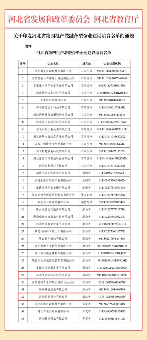 近日,河北省發(fā)展和改革委員會、河北省教育廳公布了“河北省第四批產(chǎn)教融合型企業(yè)建設(shè)培育名單”,廊坊市共4家企業(yè)入選,燕郊高新區(qū)兩家企業(yè)——河北文武信息科技有限公司和河北鼎聯(lián)科技有限公司上榜。獲批企業(yè)將獲得“金融+財政+土地+信用”組合式激勵,享受教育費附加和地方教育附加抵免政策,并將在項目審批、購買服務(wù)、金融支持、用地政策等方面得到優(yōu)先支持。