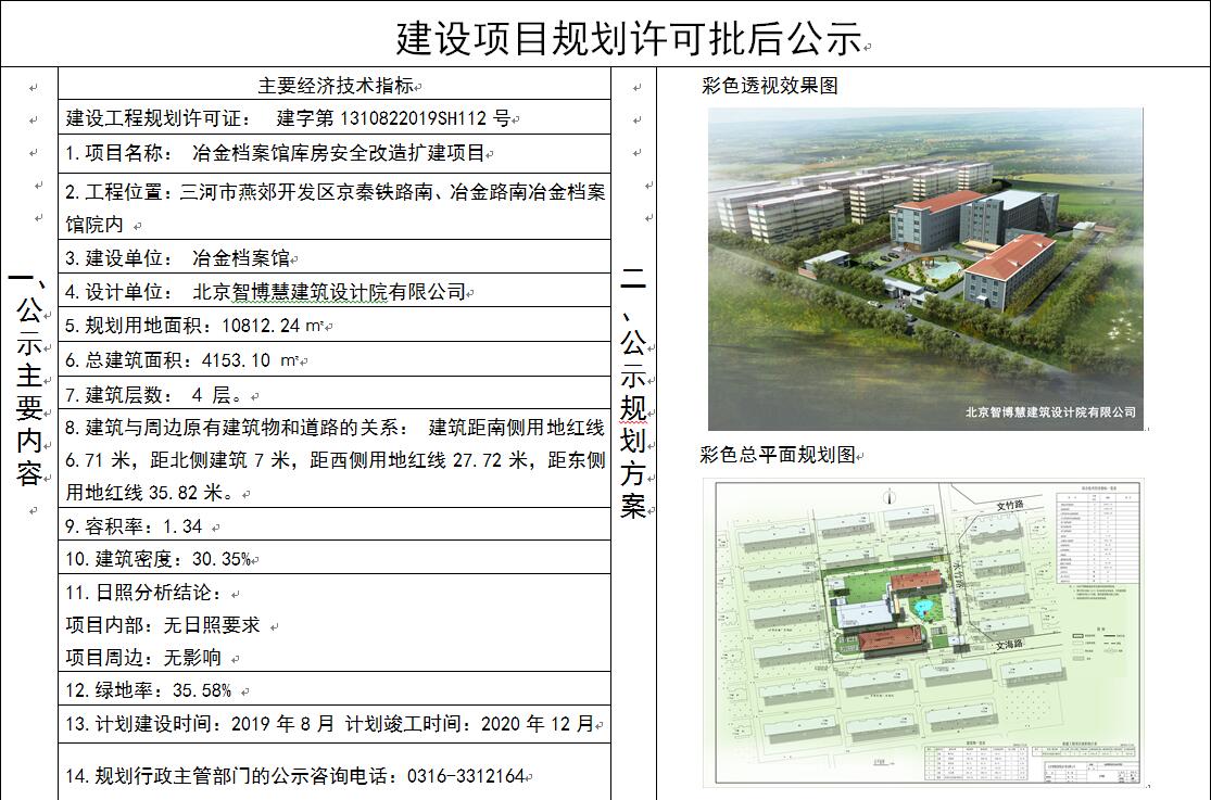 冶金檔案館申請的冶金檔案館庫房安全改造擴建項目《建設工程規劃許可證》于2019年8月5日核發,現依據河北省住建廳《關于進一步加強城鄉規劃公示公布工作的指導意見》(冀建規【2011】397號),對此項目予以公布。