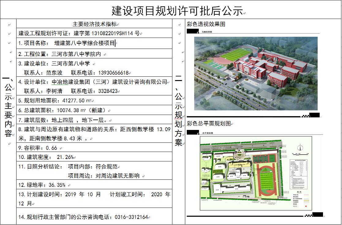 河北省三河市第八中學申請的增建第八中學綜合樓項目《建設工程規劃許可證》于2019年9月2日核發,現依據河北省住建廳《關于進一步加強城鄉規劃公示公布工作的指導意見》(冀建規【2011】397號),對此項目予以公布。
