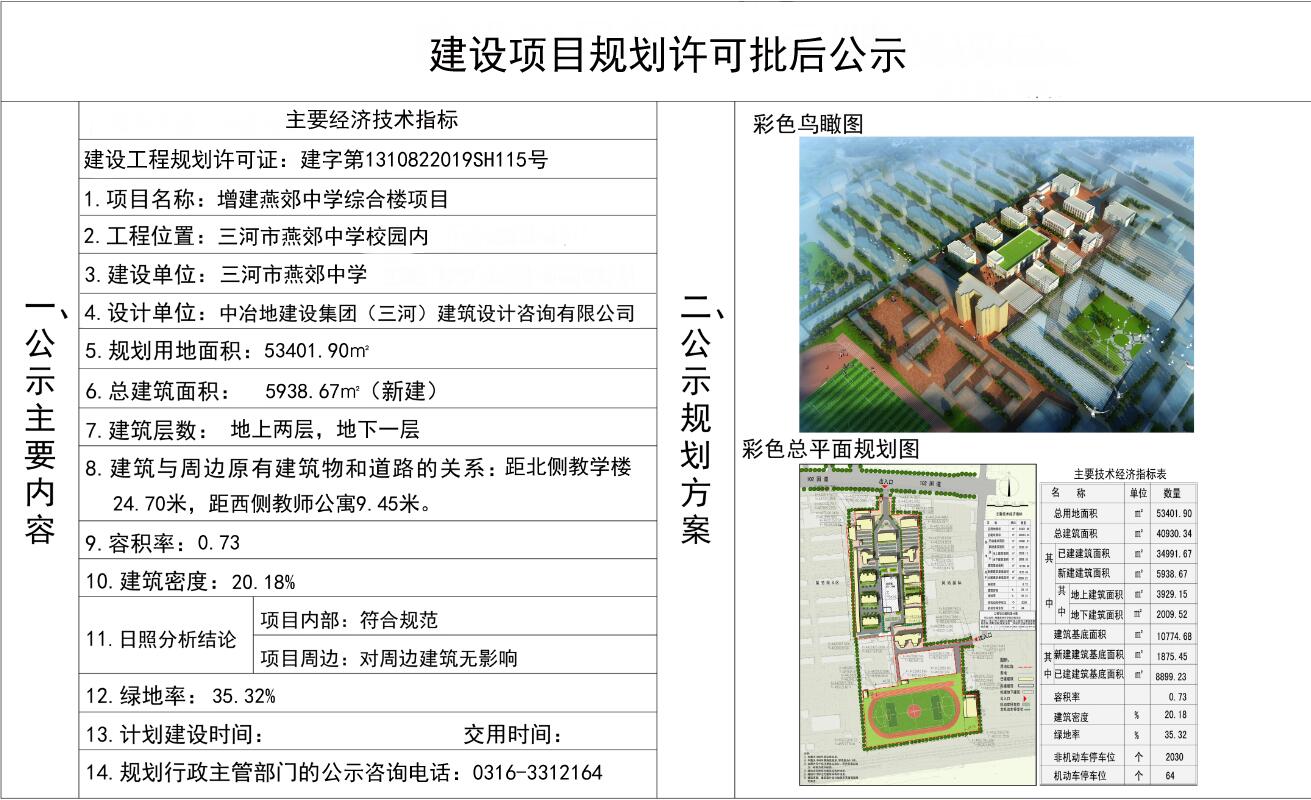 三河市燕郊中學申請的增建燕郊中學綜合樓項目《建設工程規劃許可證》于2019年9月3日核發,現依據河北省住建廳《關于進一步加強城鄉規劃公示公布工作的指導意見》(冀建規【2011】397號),對此項目予以公布。