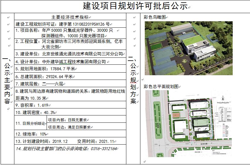 北京世維通光通訊技術(shù)有限公司三河分公司申請(qǐng)的年產(chǎn)50000只集成光學(xué)器件、30000只探測(cè)器組件、10000只激光器項(xiàng)目2#生產(chǎn)廠房(含消防水池)《建設(shè)工程規(guī)劃許可證》于2019年10月17日核發(fā),現(xiàn)依據(jù)河北省住建廳《關(guān)于進(jìn)一步加強(qiáng)城鄉(xiāng)規(guī)劃公示公布工作的指導(dǎo)意見(jiàn)》(冀建規(guī)【2011】397號(hào)),對(duì)此項(xiàng)目予以公布。