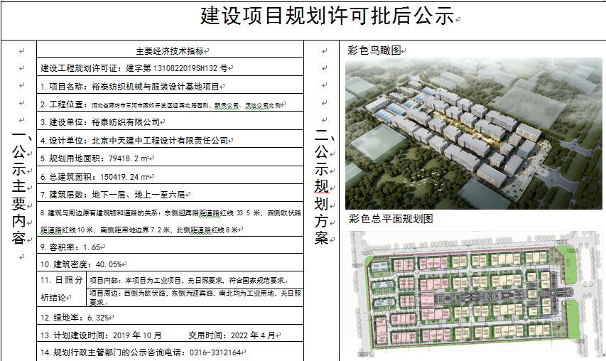 裕泰紡織有限公司申請(qǐng)的裕泰紡織機(jī)械與服裝設(shè)計(jì)基地項(xiàng)目(一期)《建設(shè)工程規(guī)劃許可證》于2019年10月30日核發(fā),現(xiàn)依據(jù)河北省住建廳《關(guān)于進(jìn)一步加強(qiáng)城鄉(xiāng)規(guī)劃公示公布工作的指導(dǎo)意見》(冀建規(guī)【2011】397號(hào)),對(duì)此項(xiàng)目予以公布。