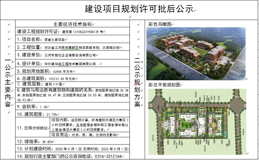 三河市哲社企業(yè)信息咨詢有限公司申請(qǐng)的學(xué)者之家項(xiàng)目《建設(shè)工程規(guī)劃許可證》于2019年12月13日核發(fā),現(xiàn)依據(jù)河北省住建廳《關(guān)于進(jìn)一步加強(qiáng)城鄉(xiāng)規(guī)劃公示公布工作的指導(dǎo)意見》(冀建規(guī)【2011】397號(hào)),對(duì)此項(xiàng)目予以公布。