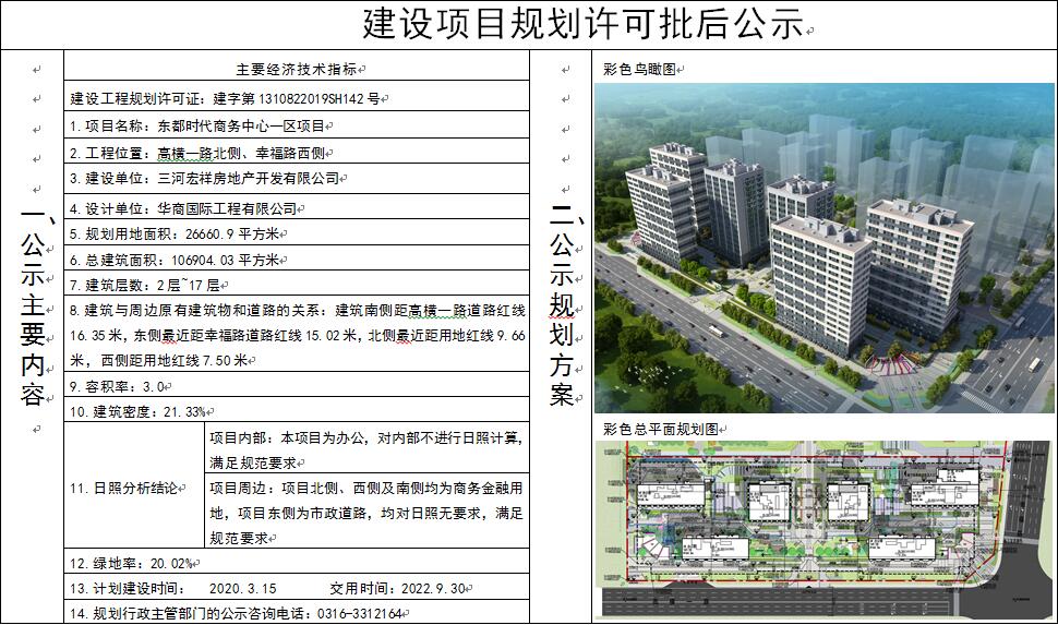 三河宏祥房地產(chǎn)開發(fā)有限公司申請的東都時代商務(wù)中心一區(qū)項(xiàng)目《建設(shè)工程規(guī)劃許可證》于2019年12月26日核發(fā),現(xiàn)依據(jù)河北省住建廳《關(guān)于進(jìn)一步加強(qiáng)城鄉(xiāng)規(guī)劃公示公布工作的指導(dǎo)意見》(冀建規(guī)【2011】397號),對此項(xiàng)目予以公布。