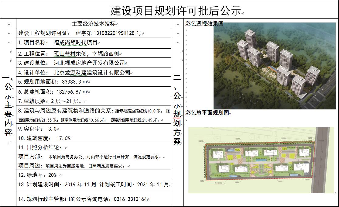 河北福成房地產(chǎn)開發(fā)有限公司申請(qǐng)的福成尚領(lǐng)時(shí)代項(xiàng)目《建設(shè)工程規(guī)劃許可證》于2019年10月22日核發(fā),現(xiàn)依據(jù)河北省住建廳《關(guān)于進(jìn)一步加強(qiáng)城鄉(xiāng)規(guī)劃公示公布工作的指導(dǎo)意見》(冀建規(guī)【2011】397號(hào)),對(duì)此項(xiàng)目予以公布。
