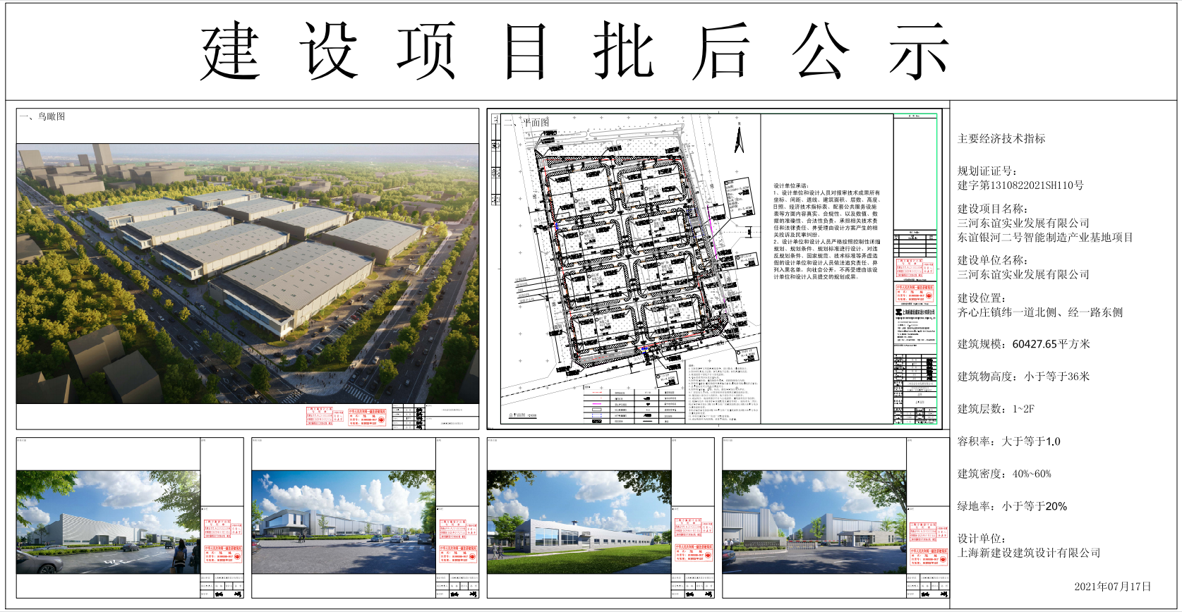 三河東誼實業發展有限公司東誼銀河二號智能制造產業基地項目《建設工程規劃許可證》已于2021年7月13日核發,現予公示。