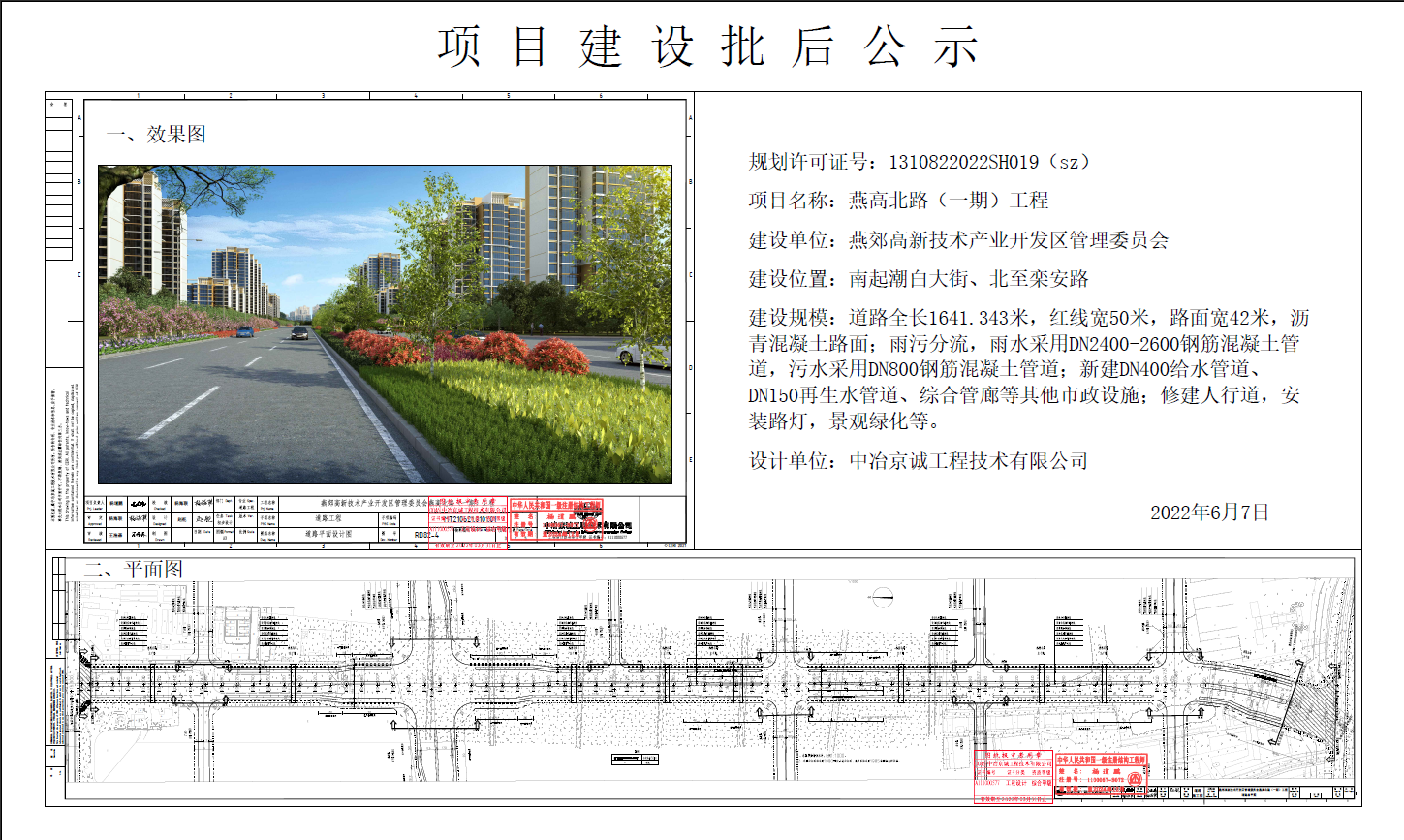 燕高北路(一期)工程(建設工程規劃許可證)于2022年6月2日核發,現予以公示。