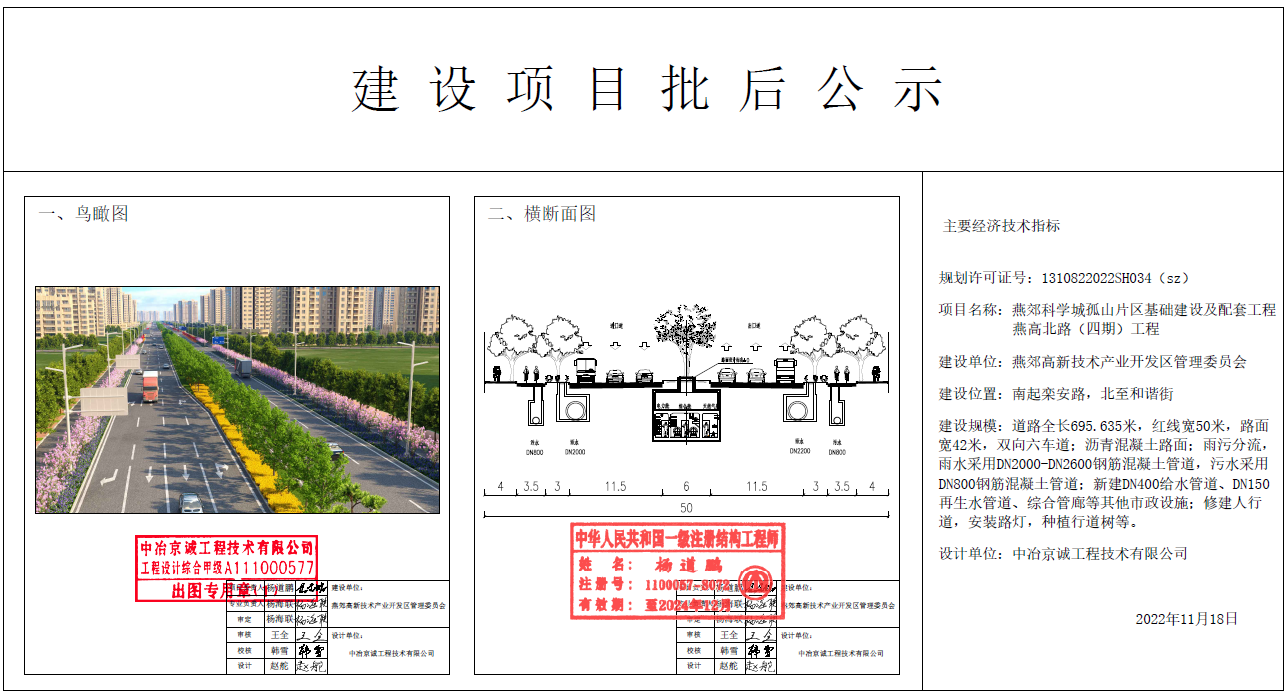 燕郊科學城孤山片區基礎建設及配套工程燕高北路(四期)工程批后公示